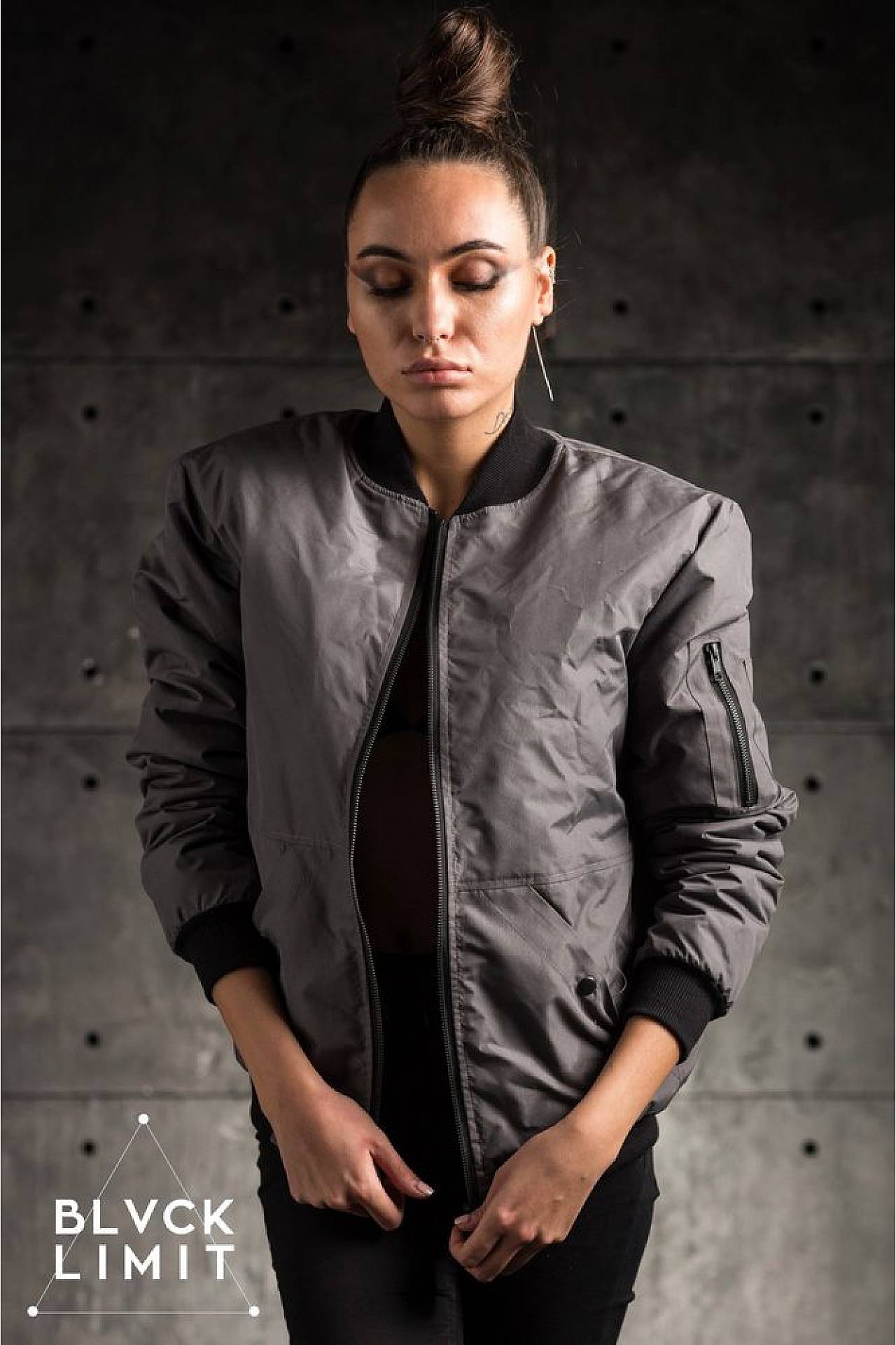 Главной изюминкой куртки серого цвета являются декоративные молнии на рукавах. Оставайтесь в тренде вместе с женским бомбером и создавайте смелые образы.