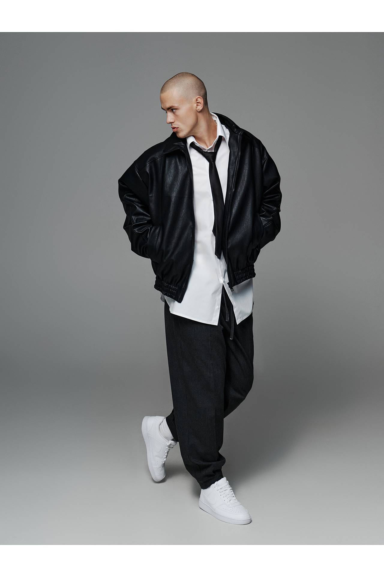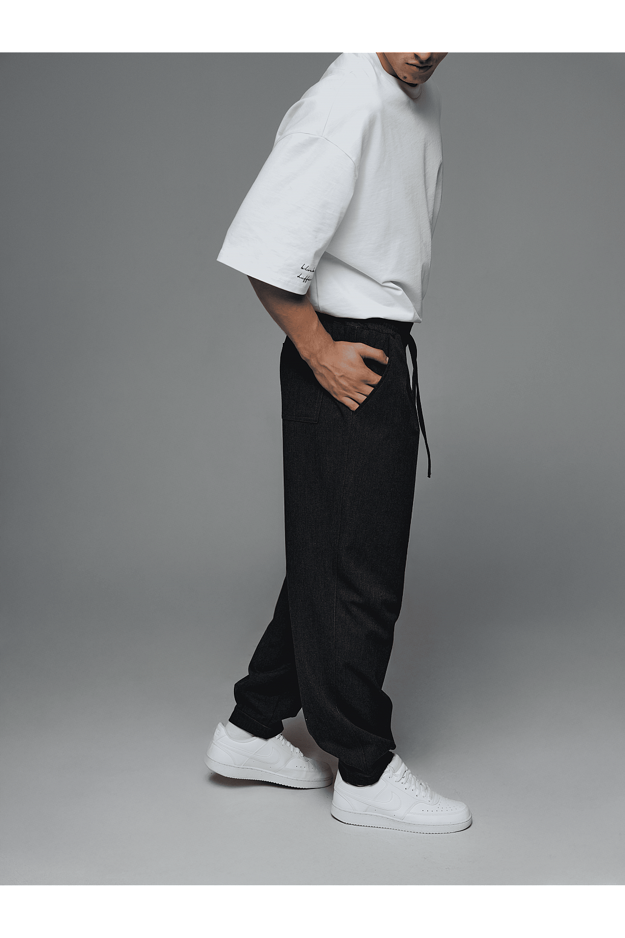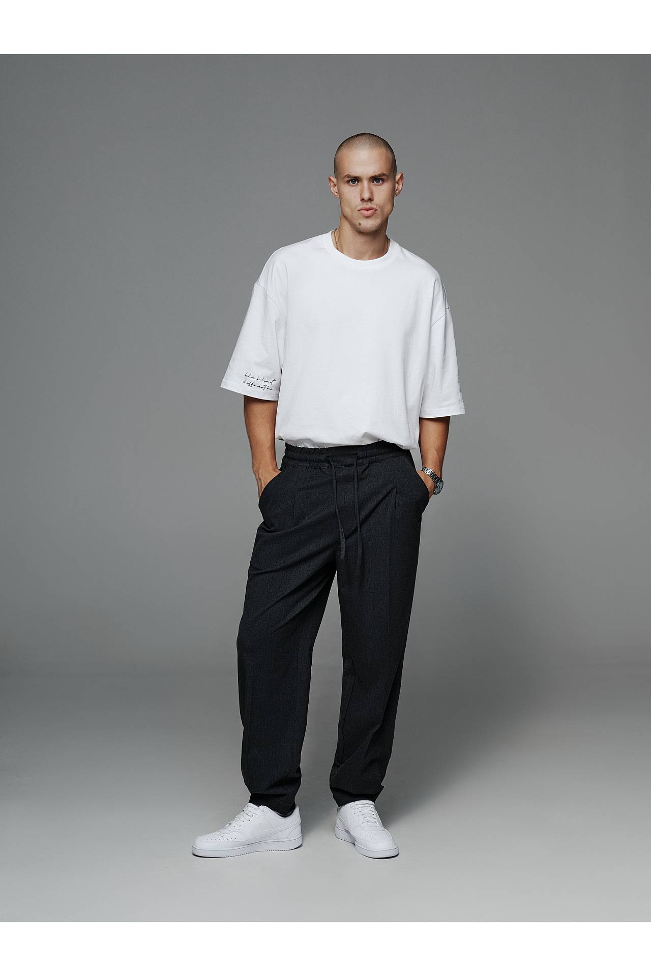 Для законченного лука джоггеры дополняем белой рубашкой oversize, или серой в клетку, и белой футболкой из плотного коттона для контрастности. Футболку и рубашки вы можете найти в заказных товарах и заказать целый лук, так как они хорошо комбинируются между собой.