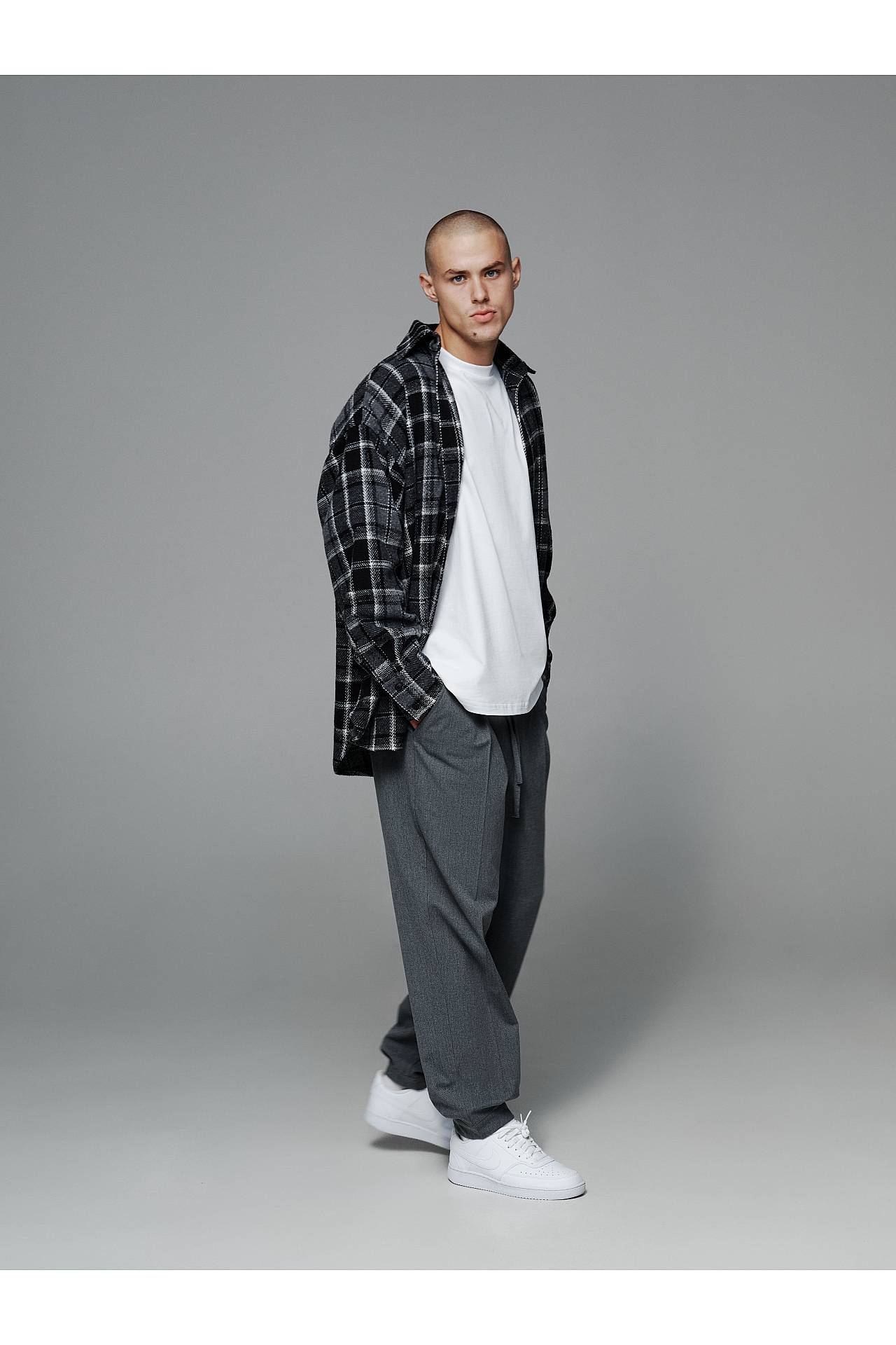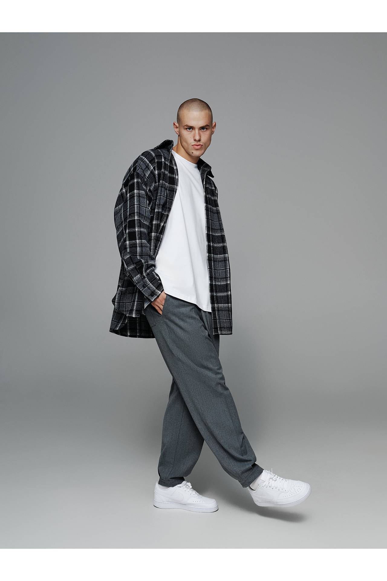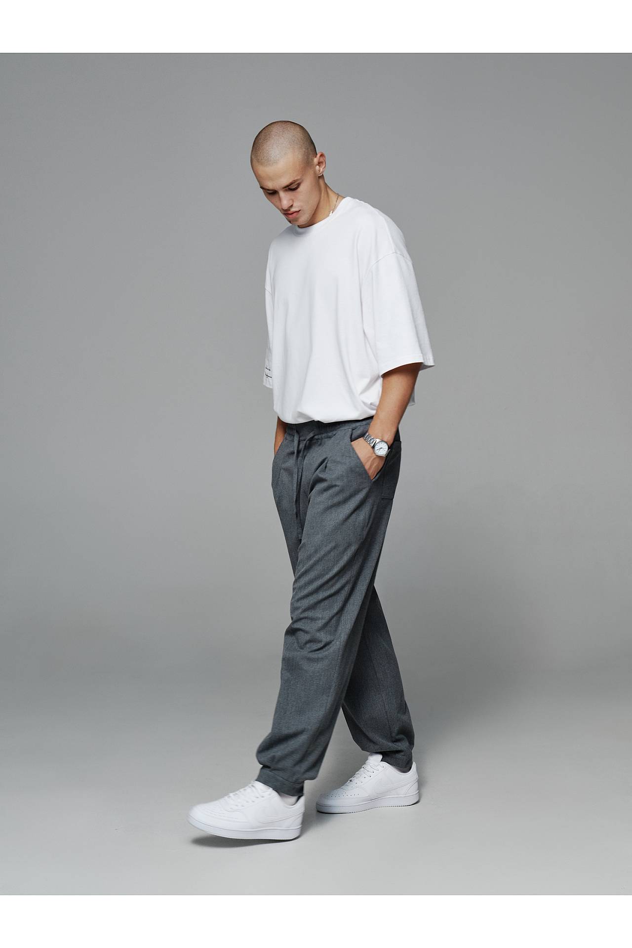 Для законченного лука джоггеры дополняем белой рубашкой oversize, или серой в клетку, и белой футболкой из плотного коттона для контрастности. Футболку и рубашки вы можете найти в заказных товарах и заказать целый лук, так как они хорошо комбинируются между собой.