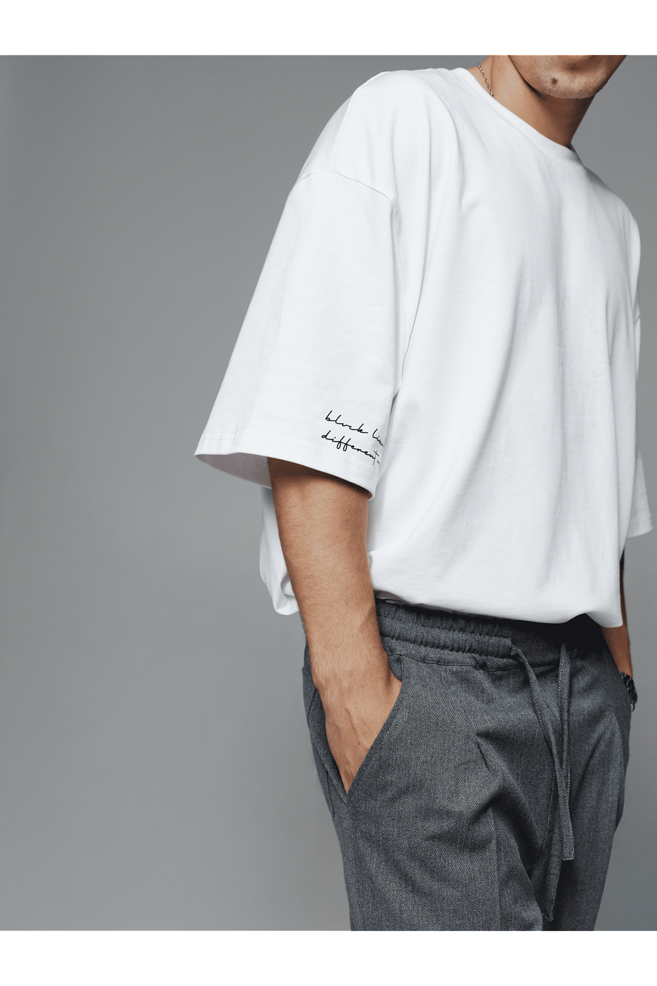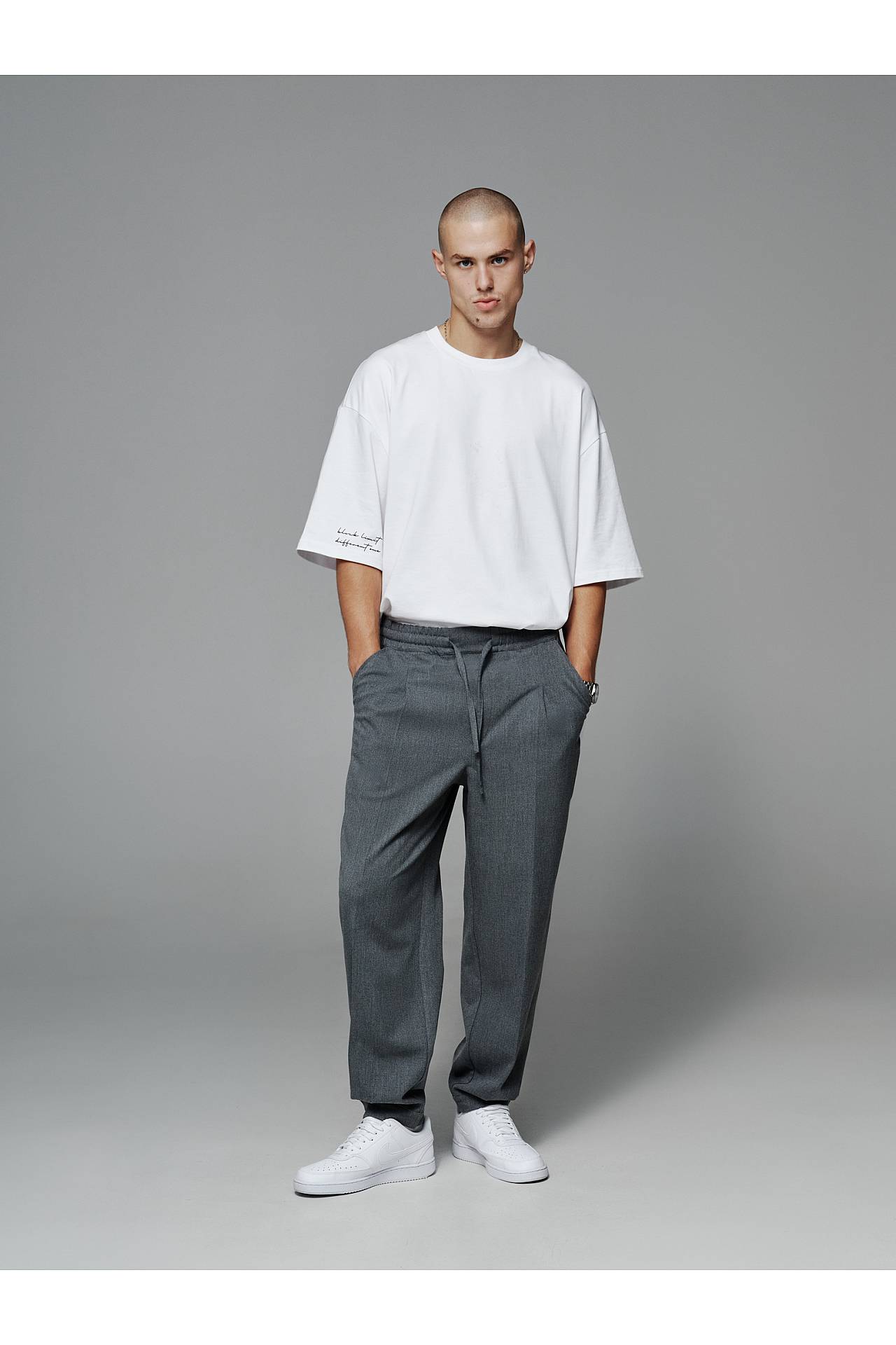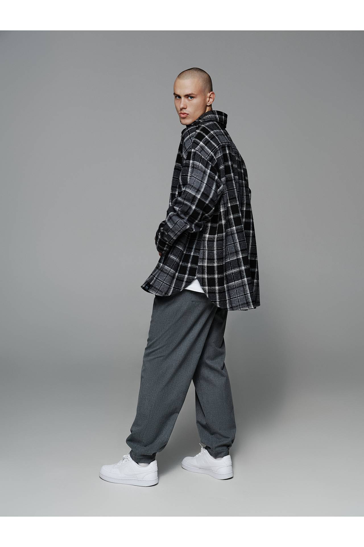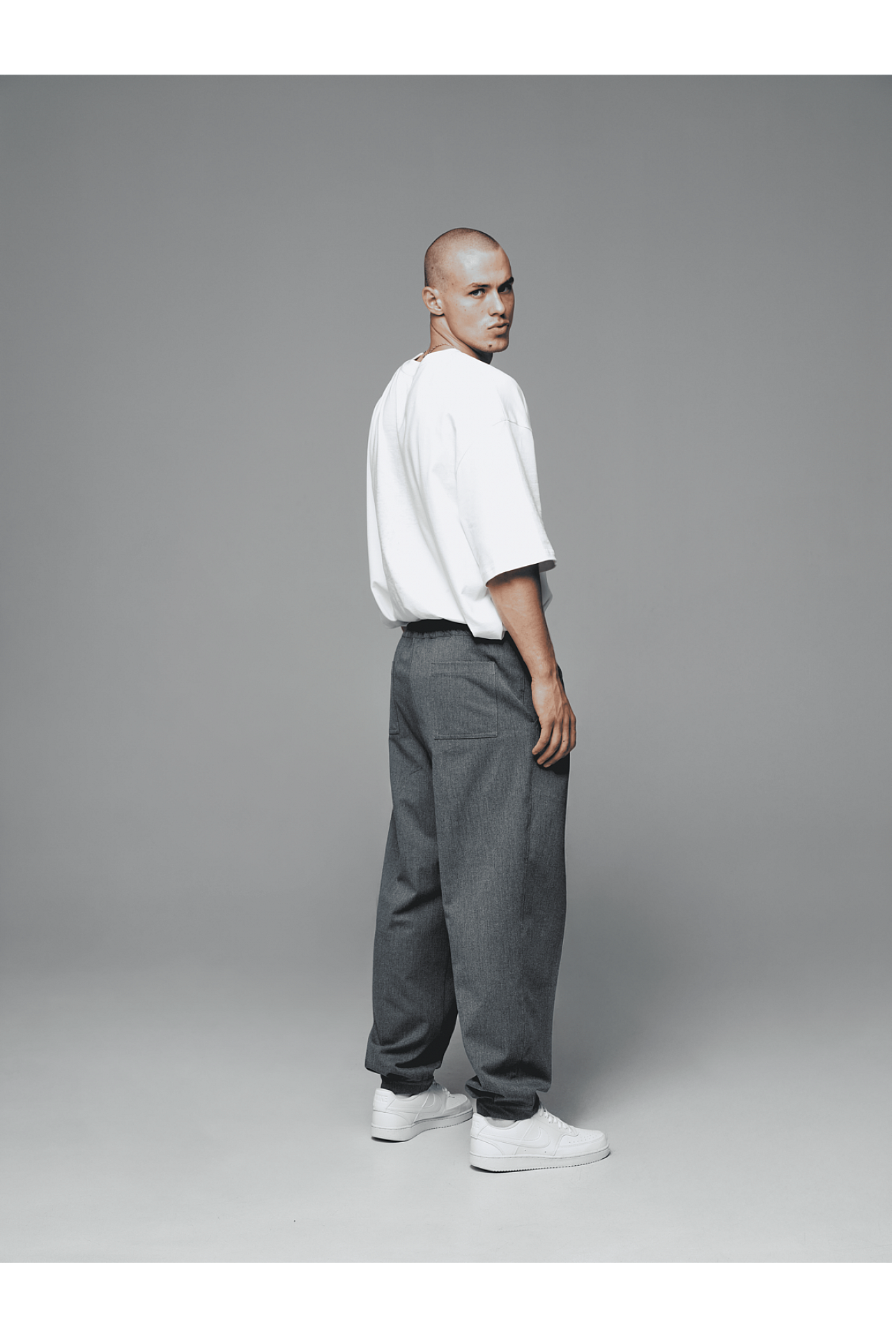 Для законченного лука джоггеры дополняем белой рубашкой oversize, или серой в клетку, и белой футболкой из плотного коттона для контрастности. Футболку и рубашки вы можете найти в заказных товарах и заказать целый лук, так как они хорошо комбинируются между собой.
