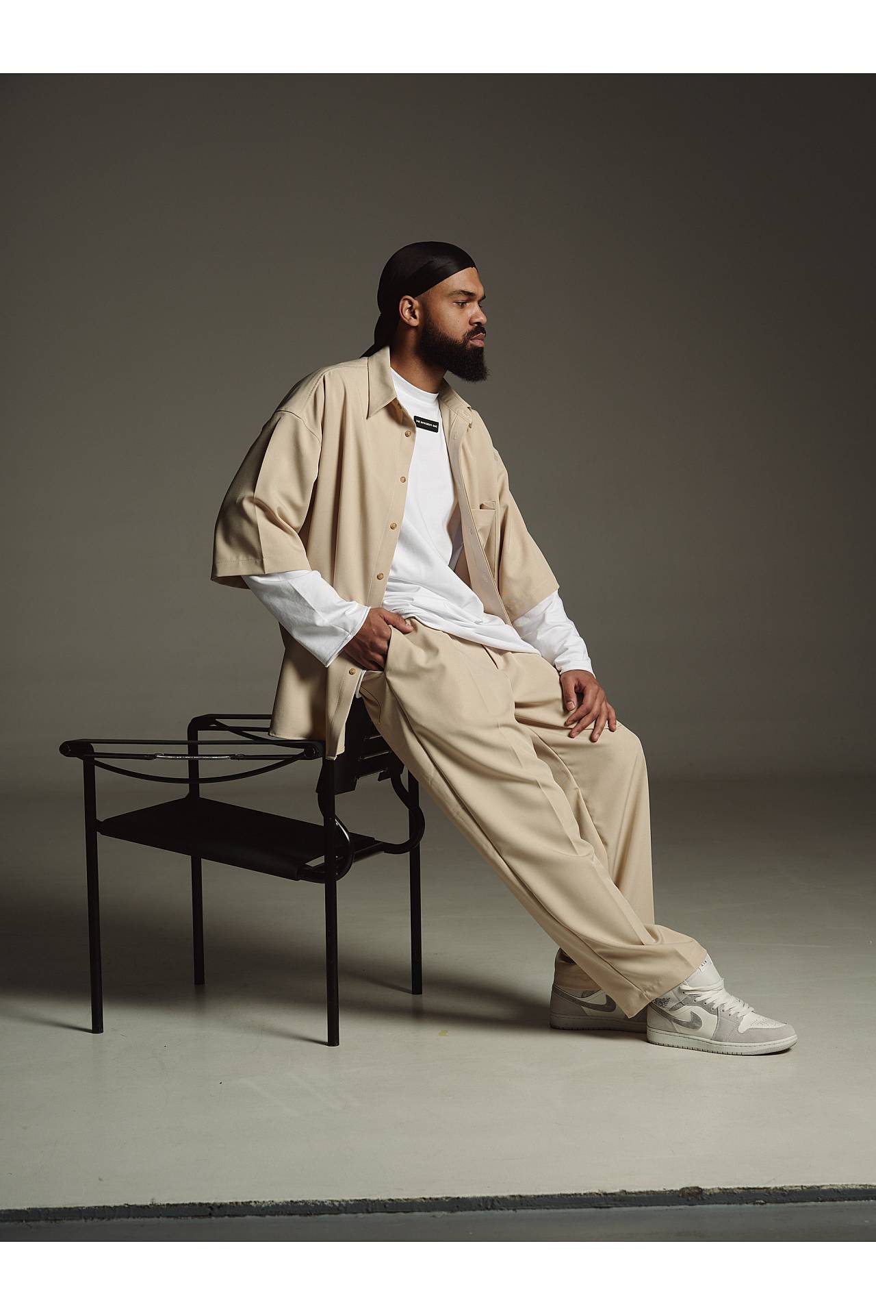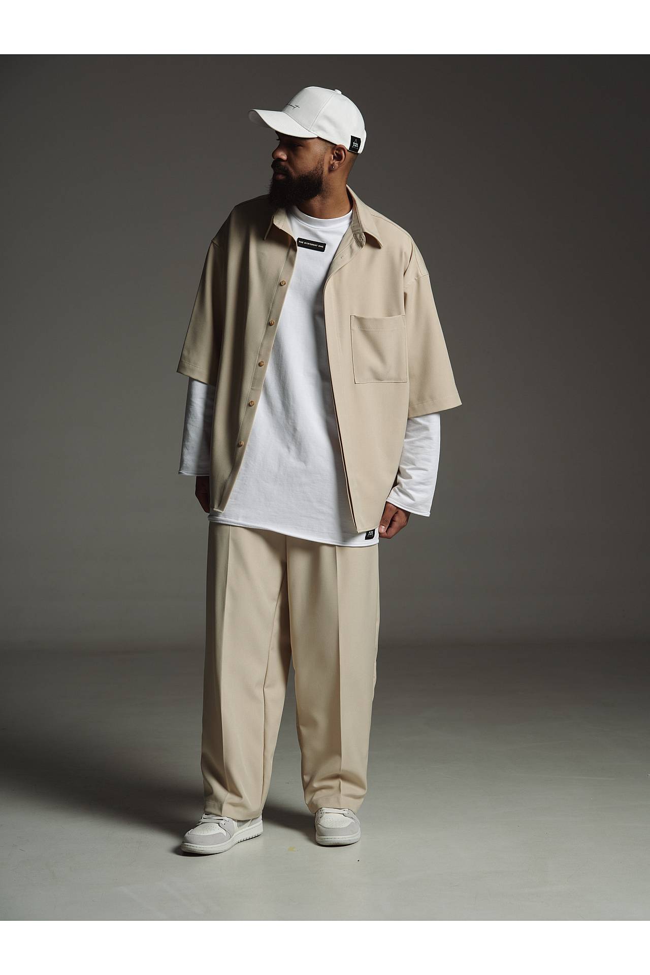 Для полноты образа брюки дополняем рубашкой из сета Macadamia и белым лонгсливом DIFFERENT ONE или белой футболкой [salt] для контрастности или черной [onyx]