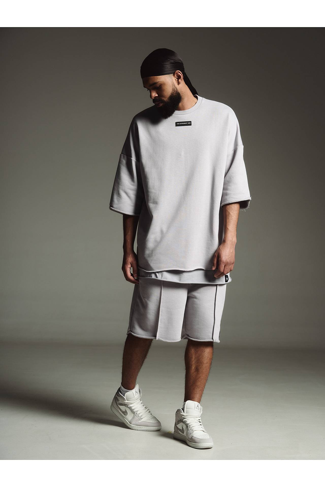 Oversized T-shirt cut with 3/4 sleeves, raw edges and DIFFERENT ONE silicone label.