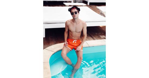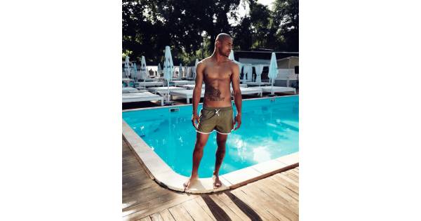 White swimming trunks with script embroidery