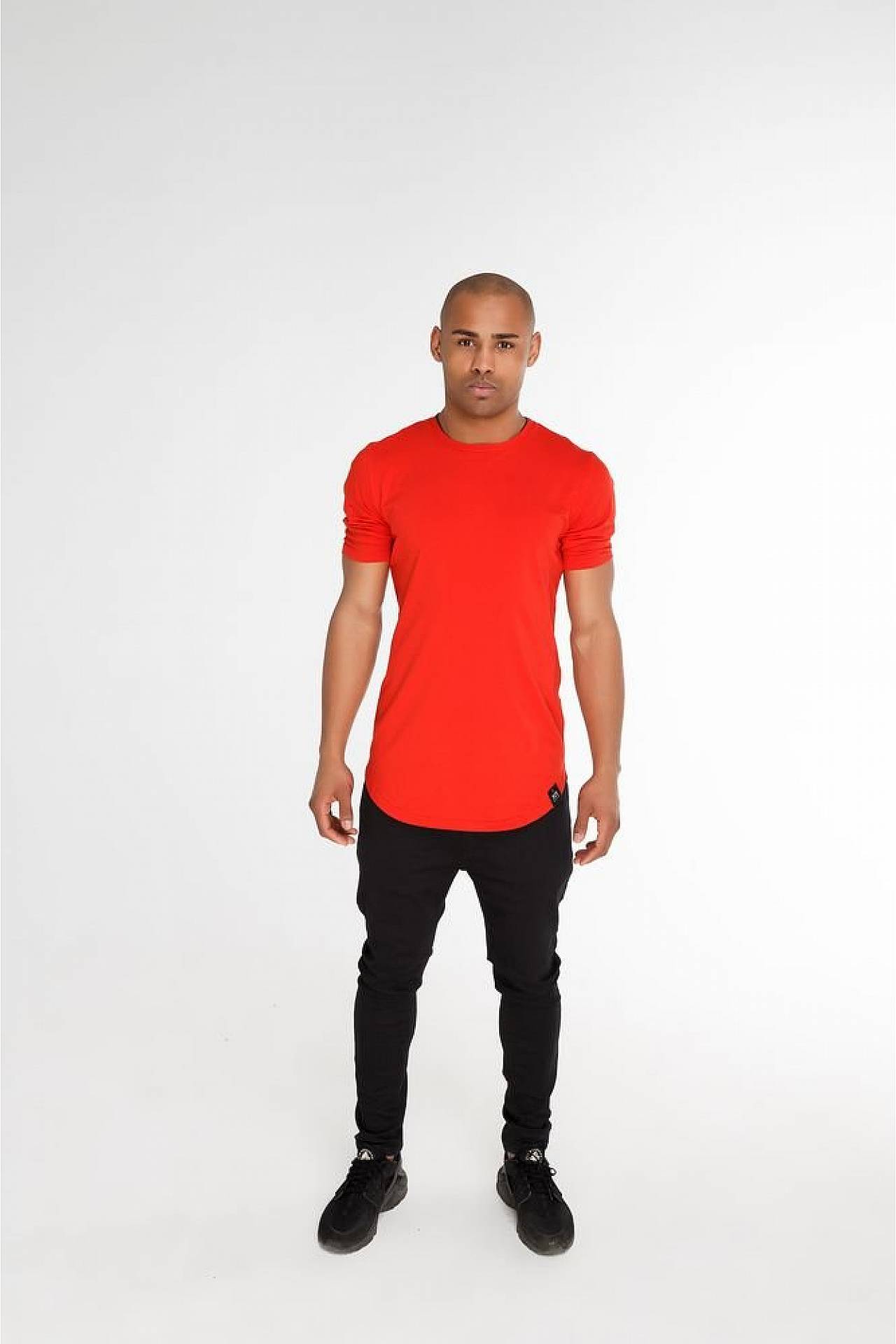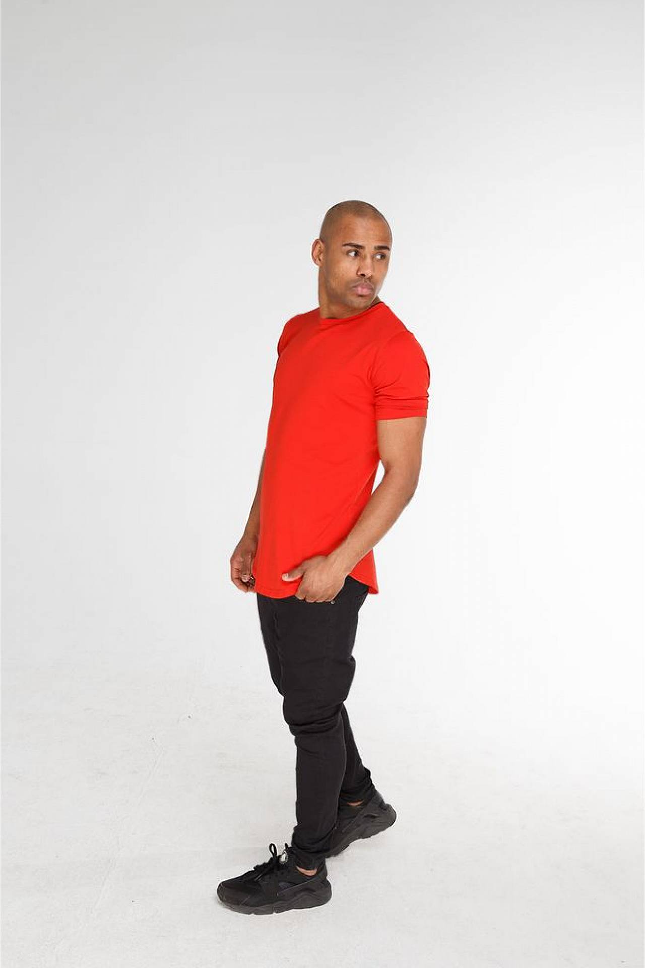 Базовая мужская футболка, красного цвета, без принтов и вышивки, с круглым низом. Выполнена из специальной комбинированной ткани, на 95% состоящей из хлопка (cotton) и на 5% из эластана для посадки по фигуре.