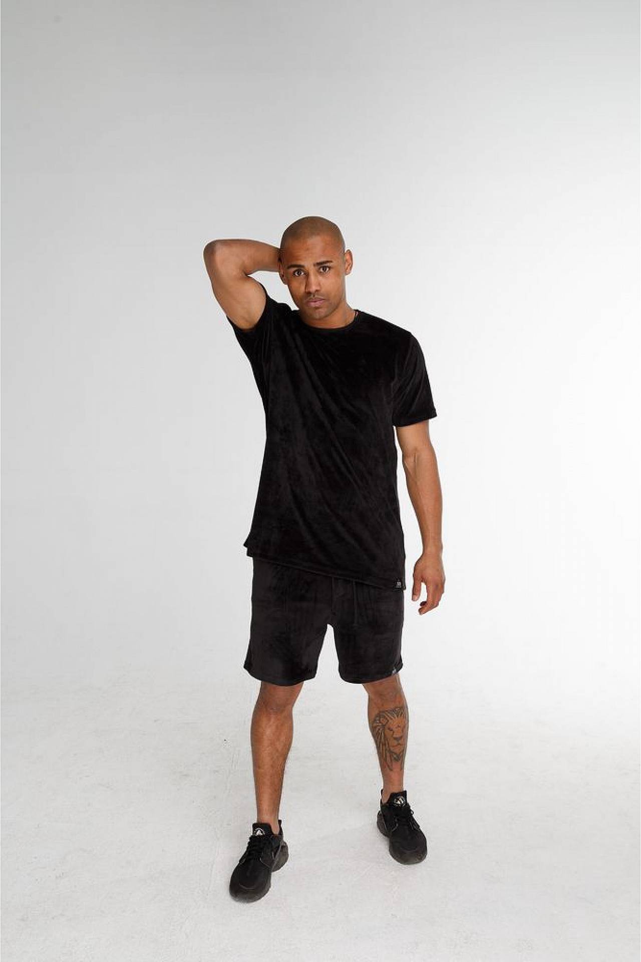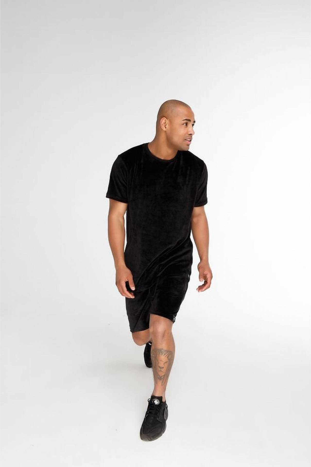 Стильная модель станет прекрасным дополнением для сильного и уверенного в себе мужчины. Черная велюровая футболка прекрасно садится по фигуре и подходит людям любой комплекции. Ее фасон достаточно просторный и не облегает тело, а значит, движения ничего не будет сковывать. И это очень важно для парней, ведь жизнь требует от них активных молниеносных действий.