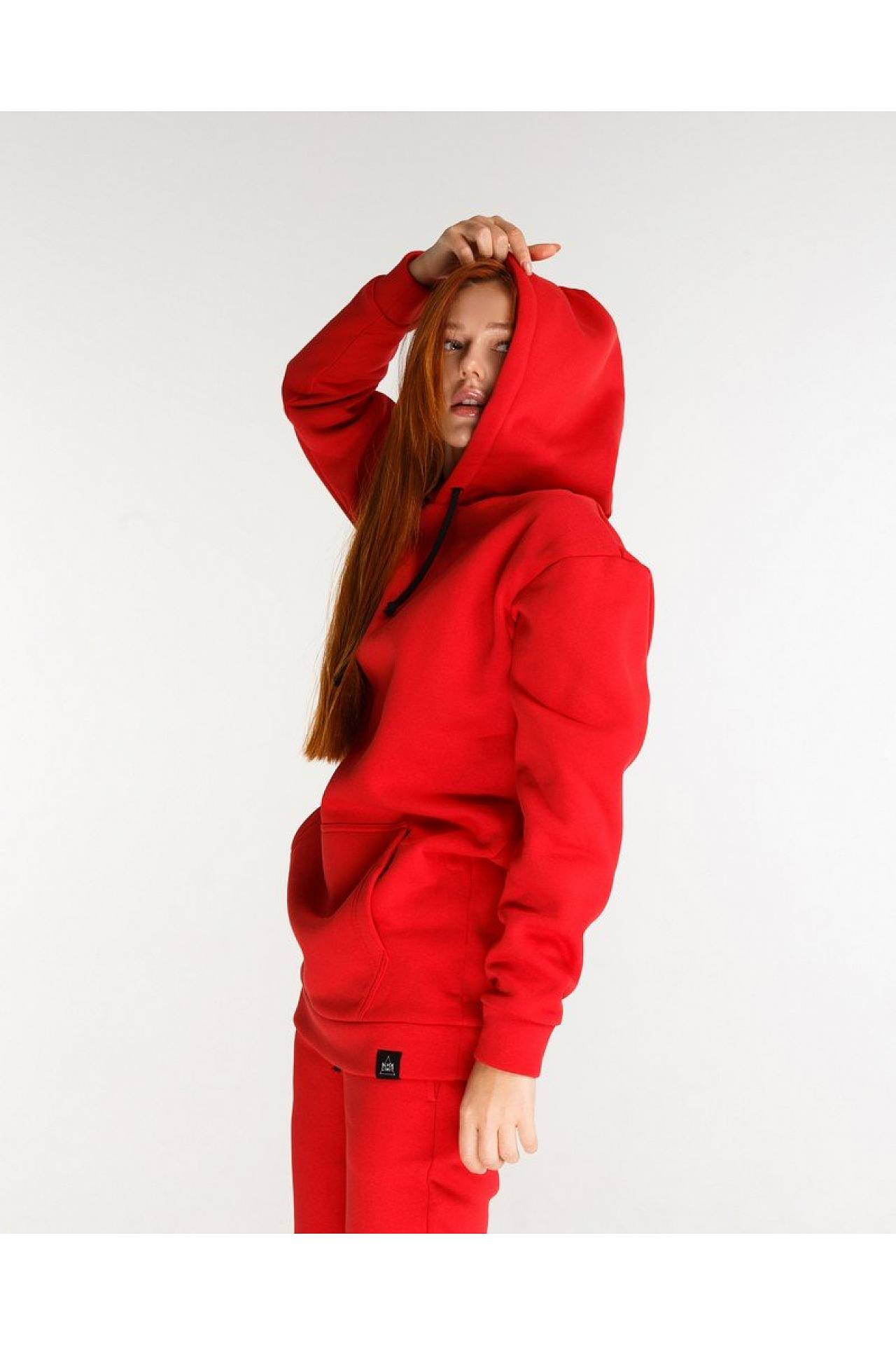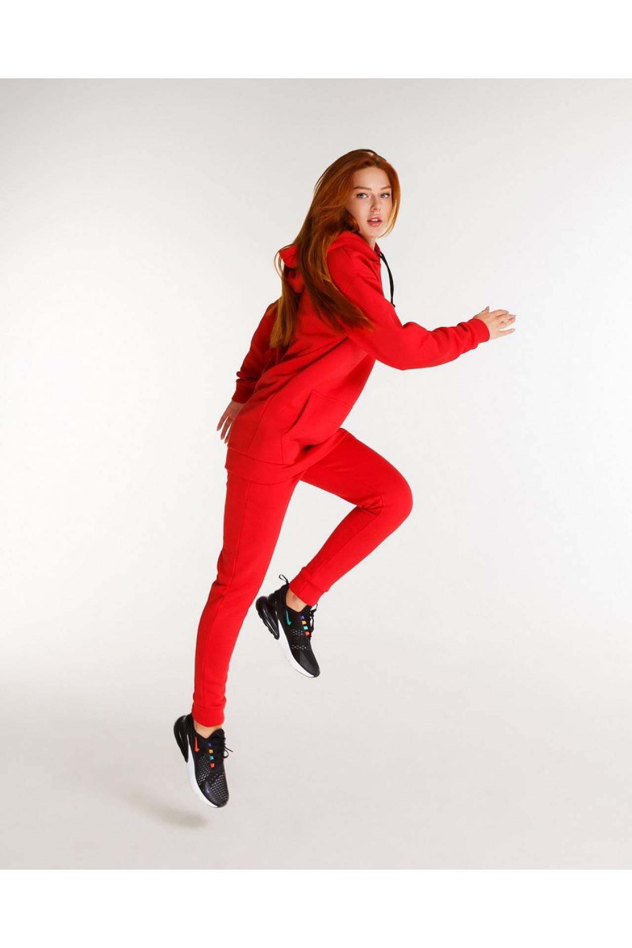 Красный цвет позволяет сделать женское худи основой образа. Это может быть практичный лук с комбинацией спортивных штанов и кроссовок. Если вы стремитесь выглядеть соблазнительно, наденьте удлиненную кофту в качестве платья, а дополните вариацию вязаными колготками и высокими ботфортами на широком каблуке.