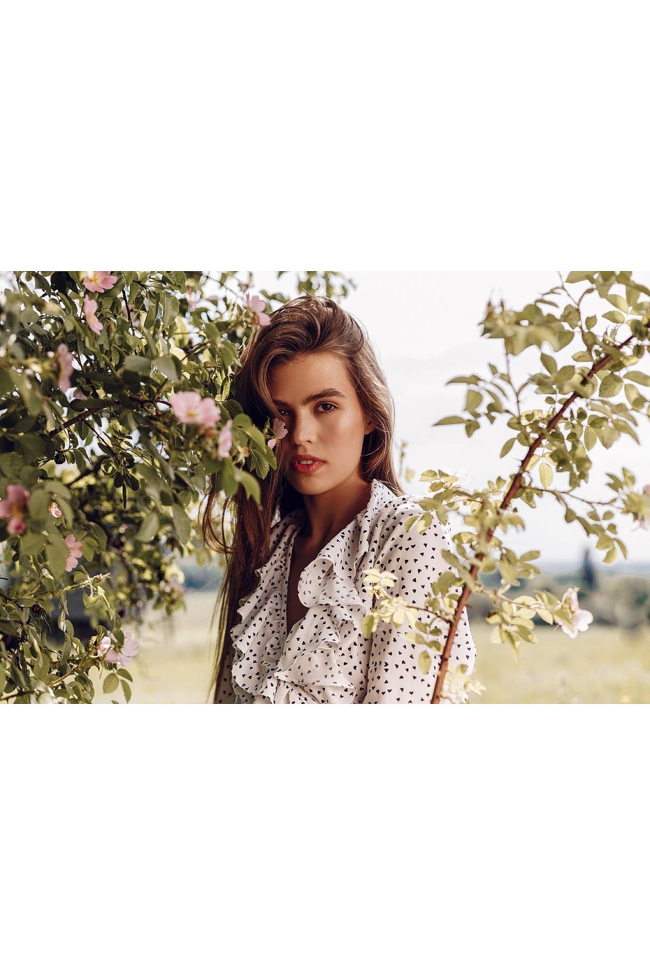 Каждое легкое дуновение ветерка будет провоцировать естественную драпировку одежды на теле. Благодаря мягкому и летящему материалу появятся очень красивые складочки. На белой ткани с принтом из синих сердечек это смотрится просто шикарно.
