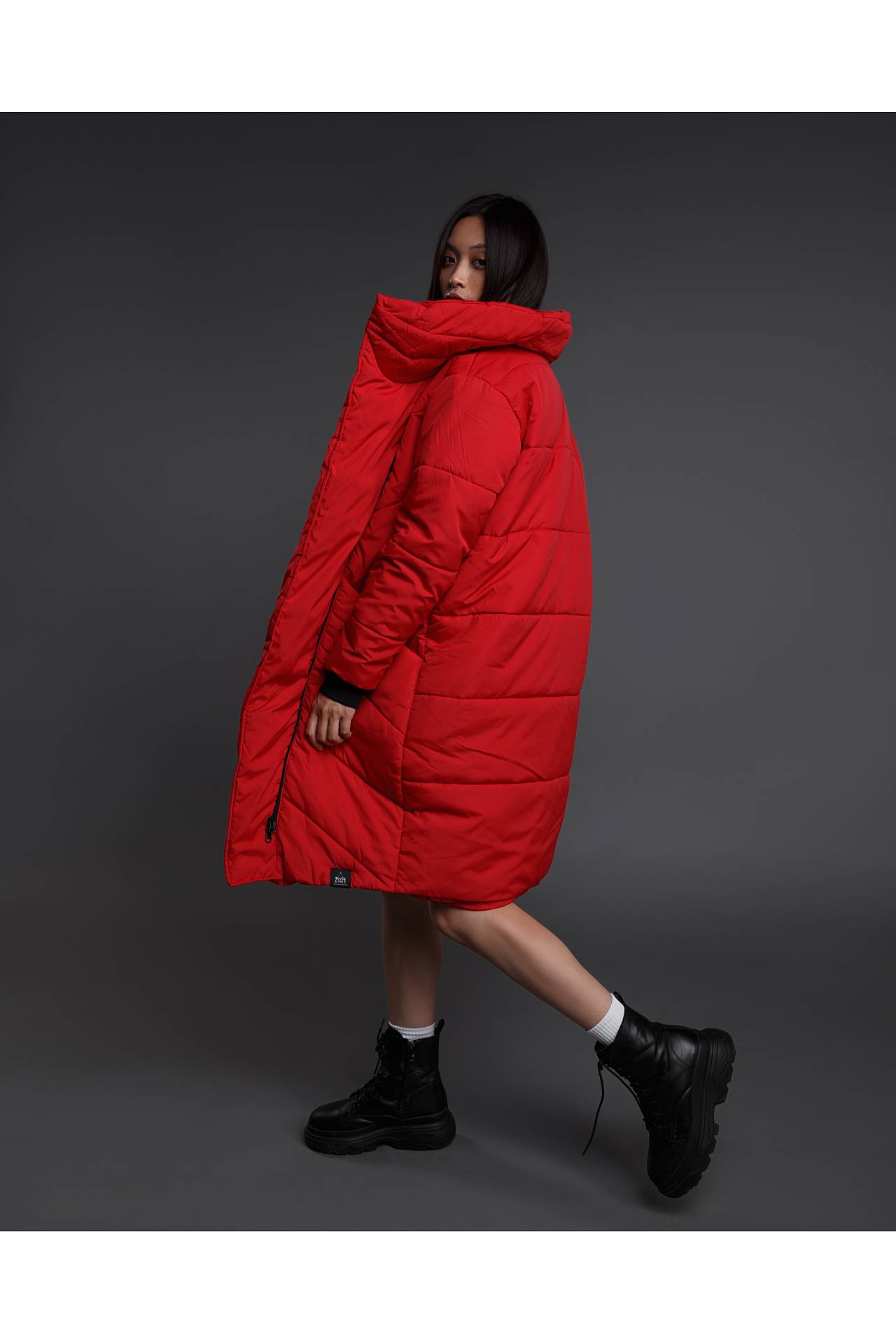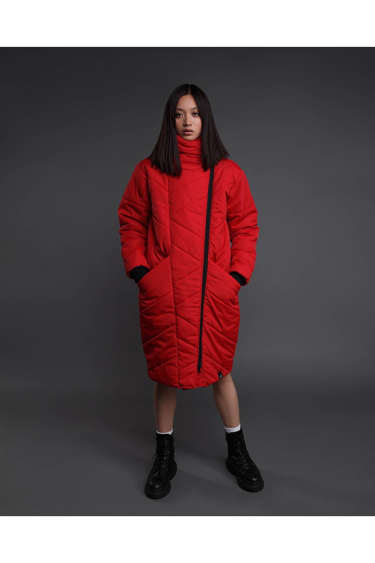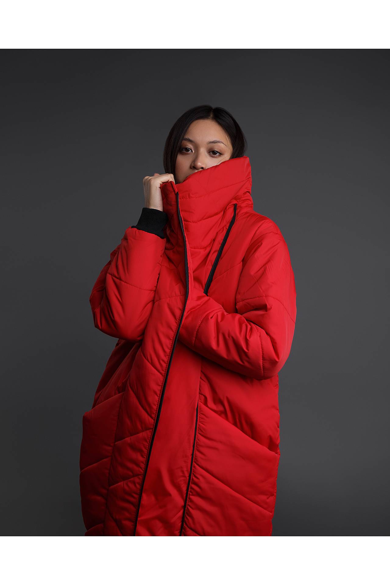 Эластичные манжеты на рукавах красного пуховика фиксируют одежду в нужном положении. Главной изюминкой фасона является высокое горло. Его можно полностью поднять вверх, или расстегнуть, дополнив образ снудом, хомутом или элегантным шарфиком.