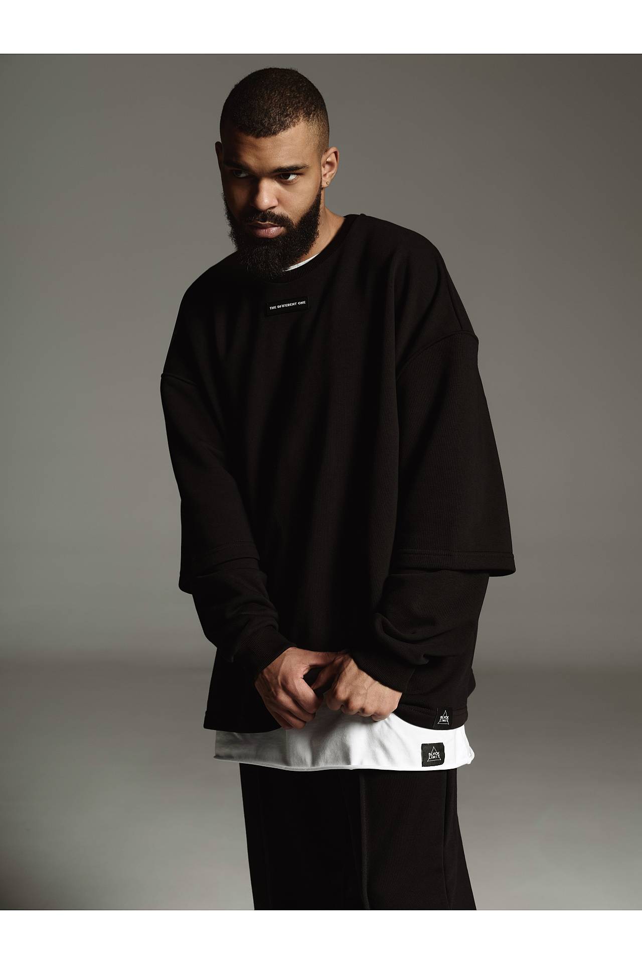 Лонг-футболка имеет oversized fit крой с вшитыми лонгсливными рукавами от плечевого шва, что создает эффект многослойности и одетой футболки поверх лонгслива.