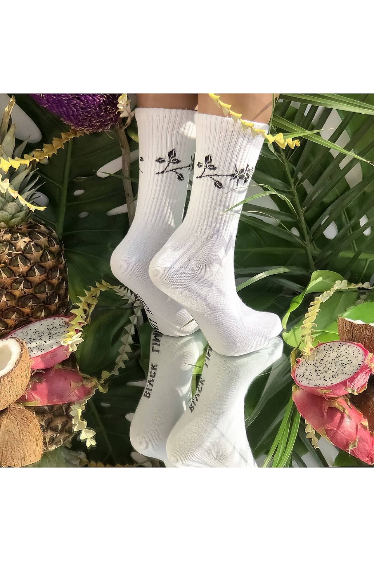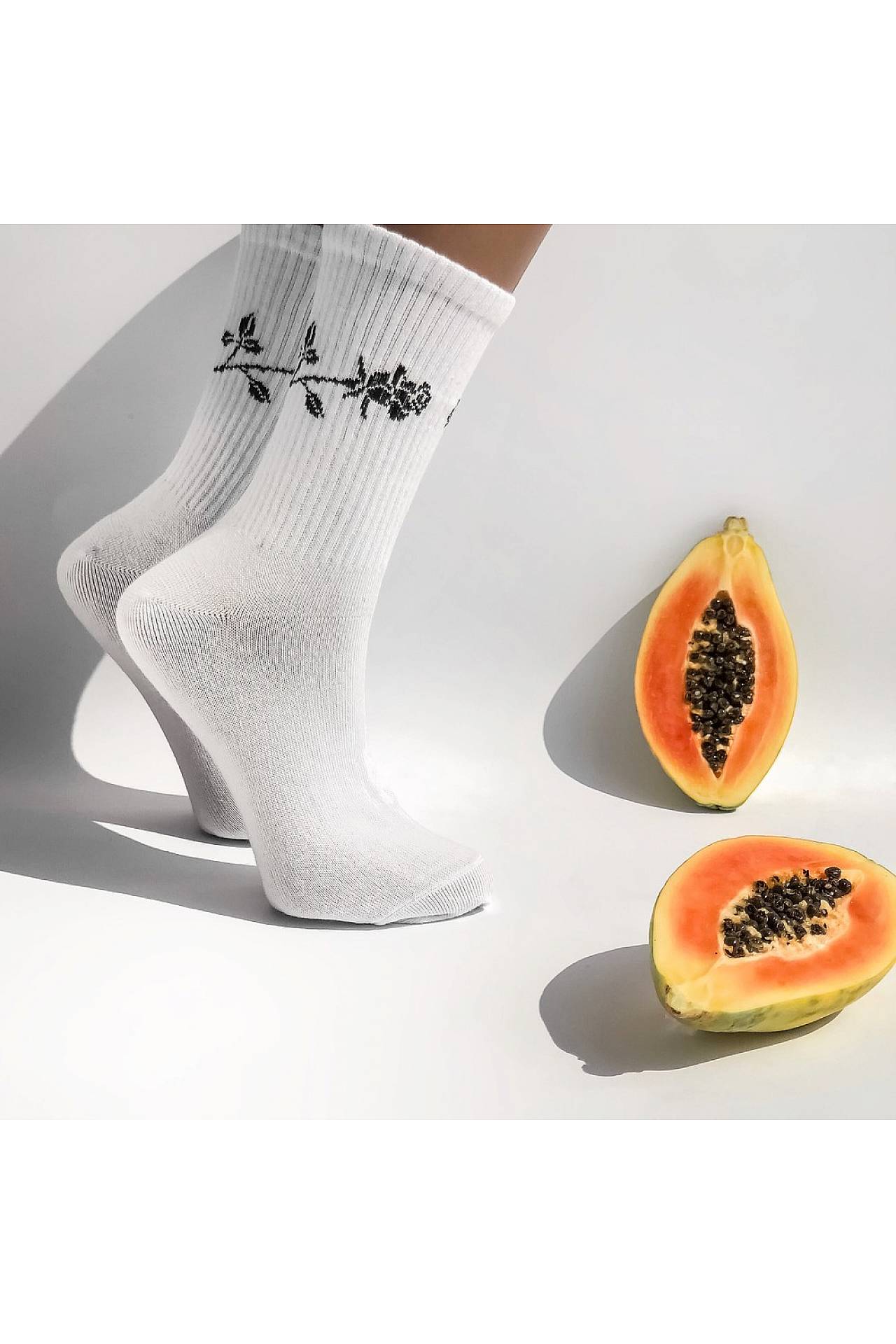 Перше, що кидається в очі – це шикарний дизайн. Жіночі шкарпетки мають незвичайний принт у вигляді троянди. Вона витончена і гармонійна, як раз те, що потрібно для дівчини. Чорний квітка на білому фон виглядає лаконічно і стримано.