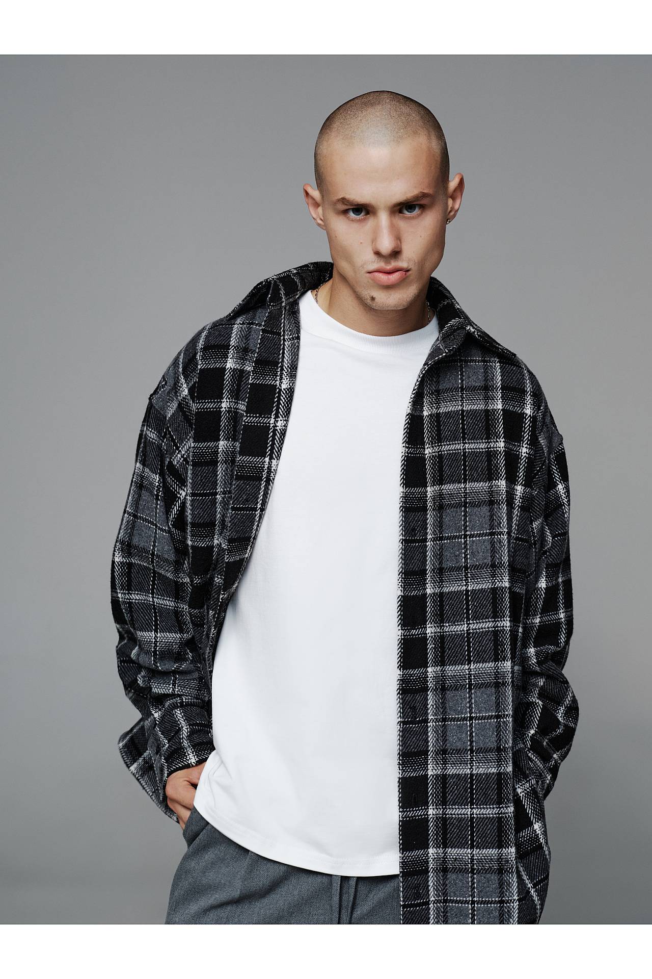 Для закінченого луку сорочку доповнюємо світло сірими або темно сірими вовняними джогеррами та білою футболкою з щільного котону. Всі ці позиції ви можете ви можете знайти в рекомендованих товарах та замовити цілий лук, так як вони гарно комбінуються між собою.