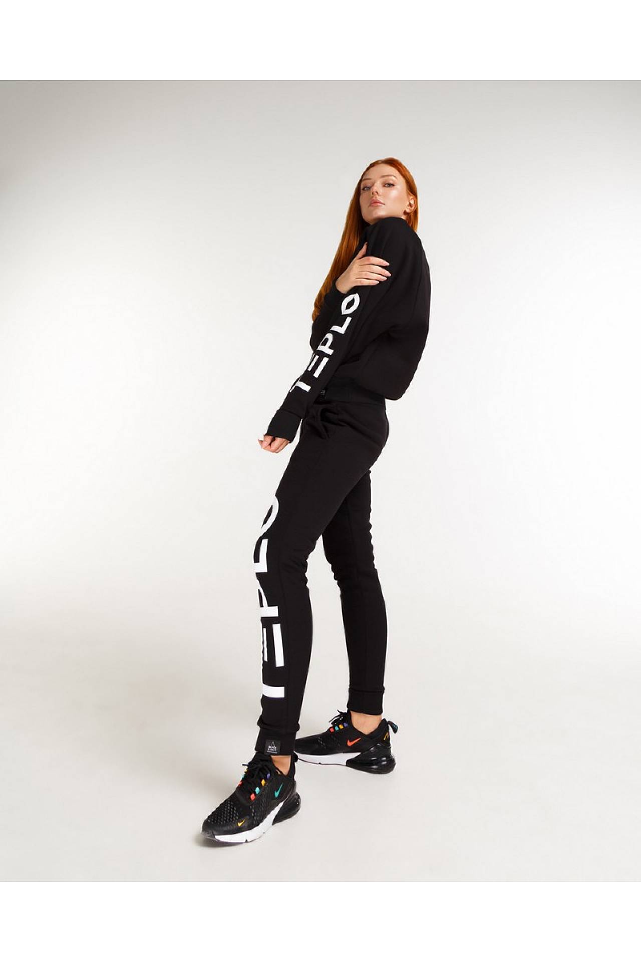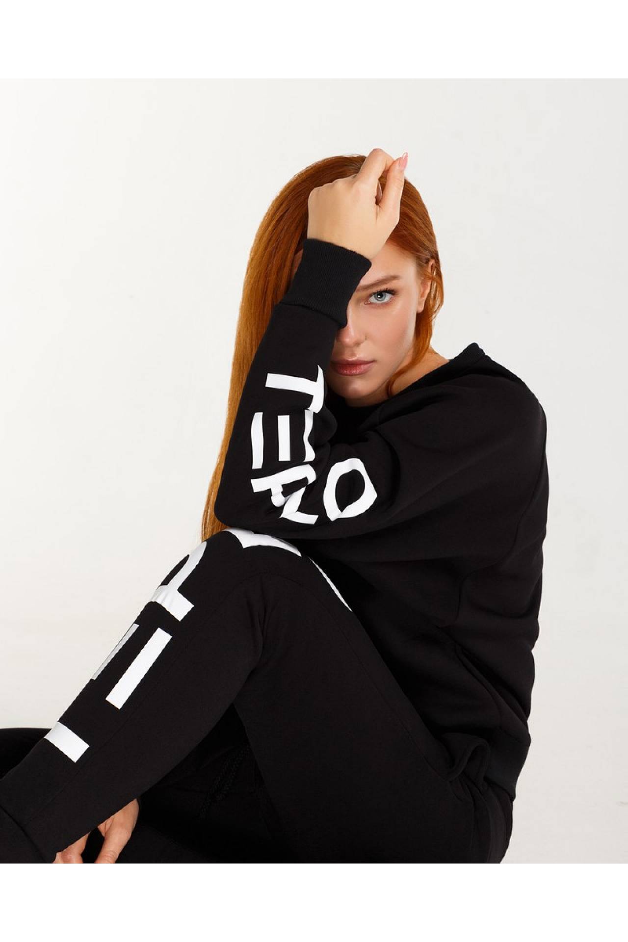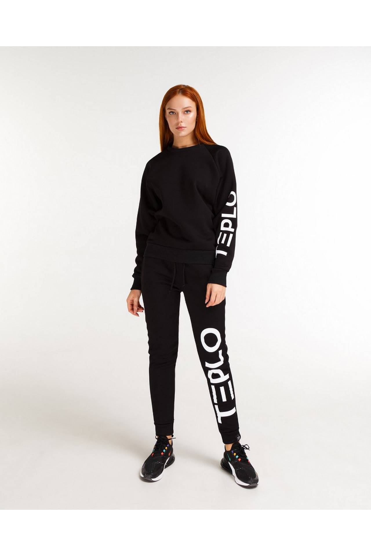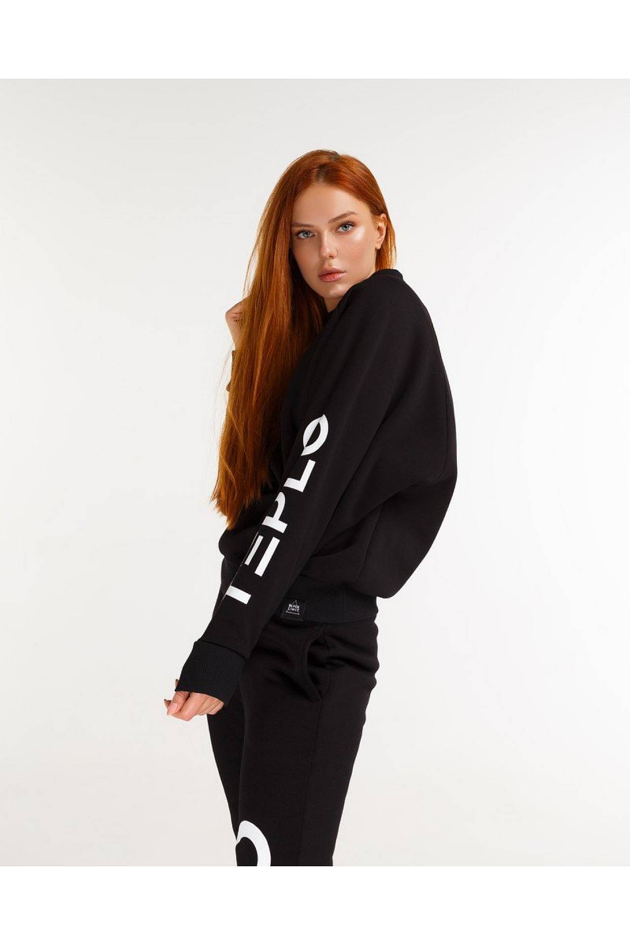 Чорний жіночий світшот крою оверсайз, виконаний з м'якої тканини (86% бавовни (cotton), 14% поліестеру), з принтом TEPLO на зовнішній стороні лівого рукава.