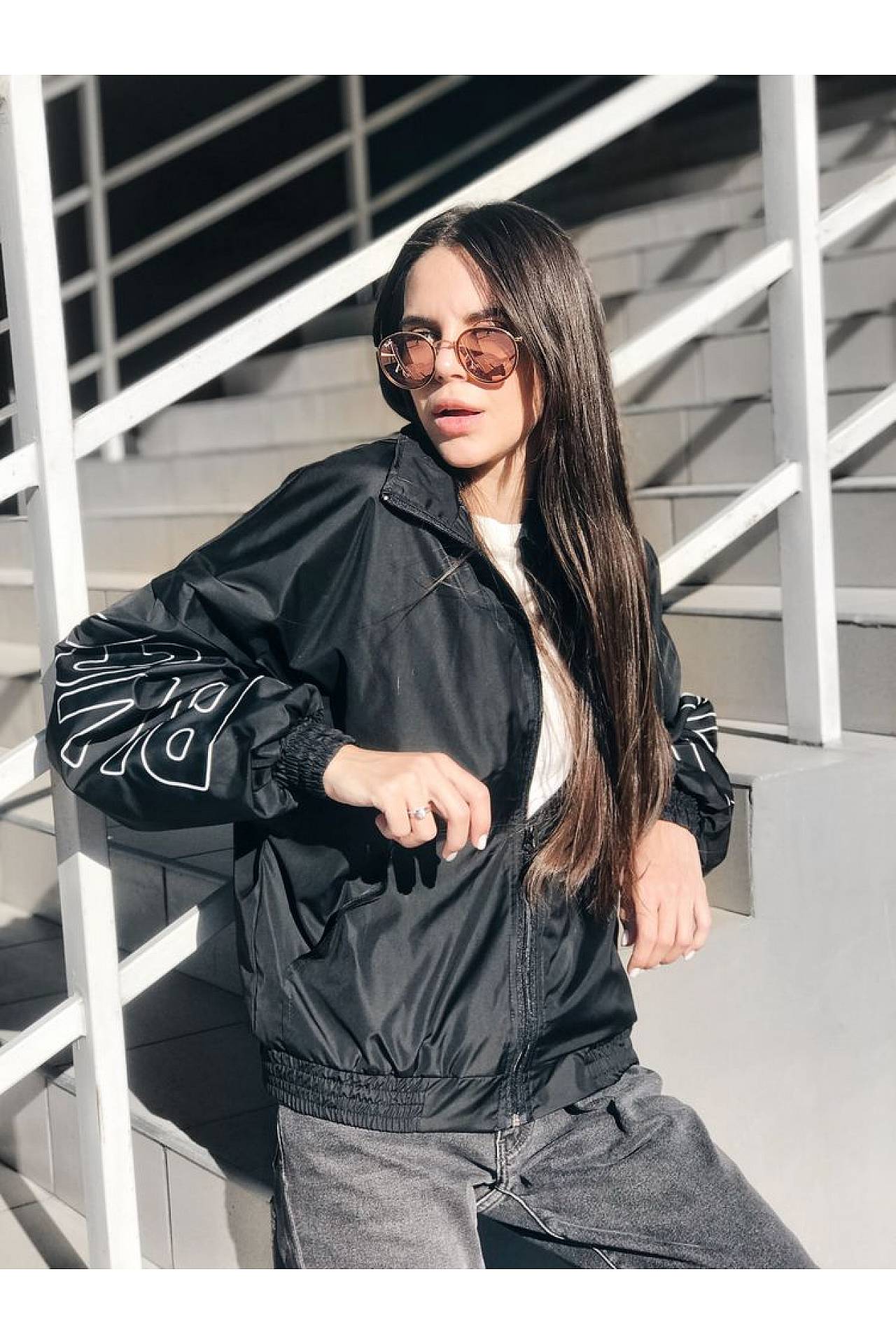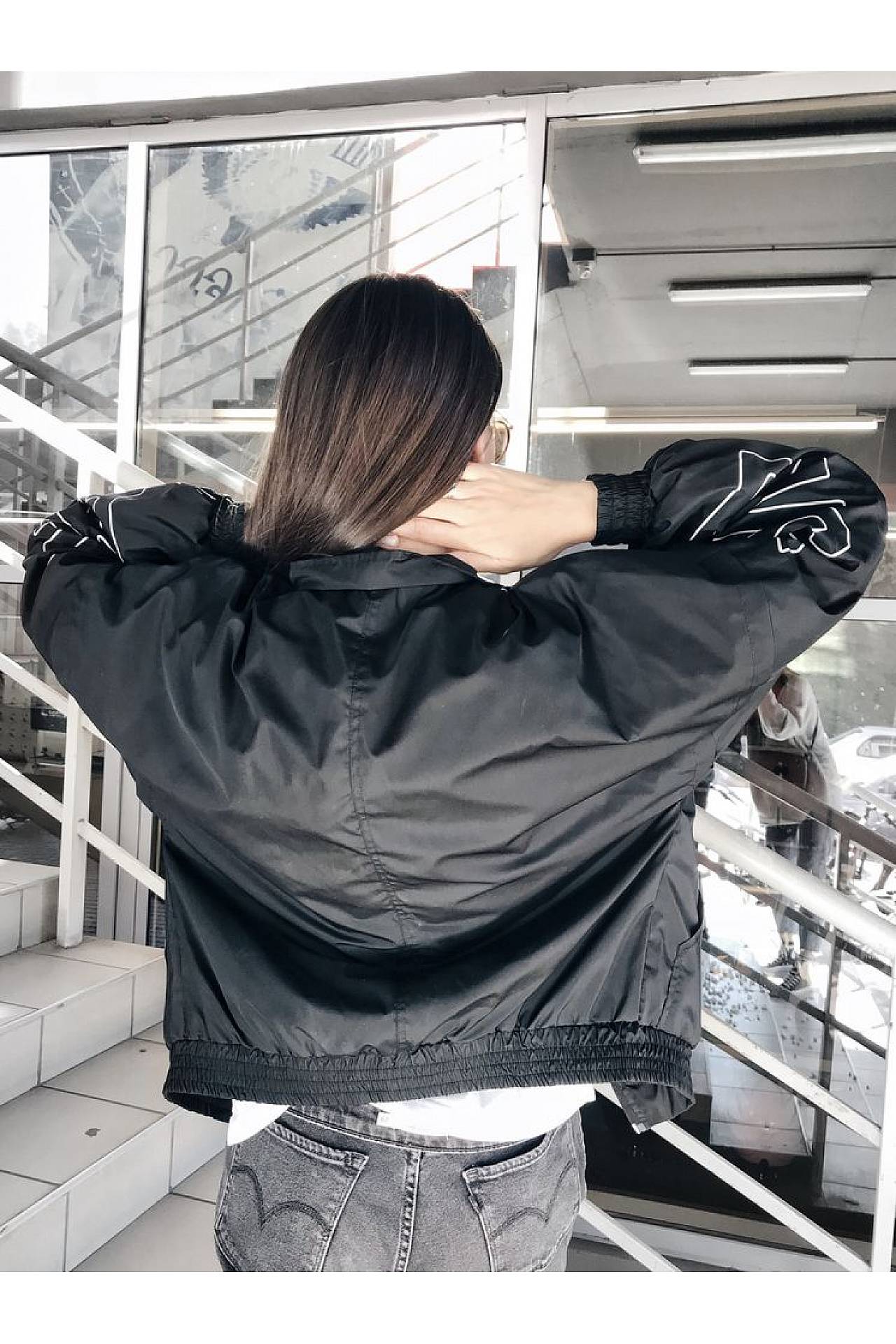 Изюминкой черной ветровки являются широкие рукава. Они визуально делают плечи шире, поэтому внимание концентрируется на тонкой талии и стройных ножках. Кроме того, именно на рукава нанесен контрастный белый принт в виде брендовой символики. Это подчеркнет ваш выбор и повысит имидж. Сочетать ветровку можно с любым низом. Идеальная обувь – ботильоны, ботинки с грубым дизайном, сапоги, ботфорты, кроссовки и слипоны.