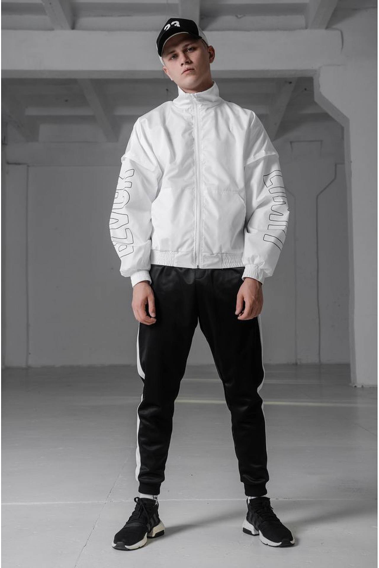 Изюминкой модели является дизайн. Белая ветровка с принтом смотрится стильно и элегантно именно благодаря крупным буквам на рукавах. Брендовая надпись очерчена черным цветом. Классическое сочетание тонов подчеркнет консервативность в спортивном луке.